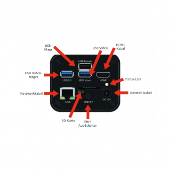 Built-in Mouse Control (HDMI-Betriebsart): die mitgelieferte Maus wird an den USB-Anschluss der Kamera angeschlossen. Mit der Maus können Sie dann das On-Screen-Display Menü bedienen und mit seiner Hilfe Bilder und Videos aufnehmen und alle Kameraeinstellungen vornehmen - komplett ohne PC und Software-Installationen!